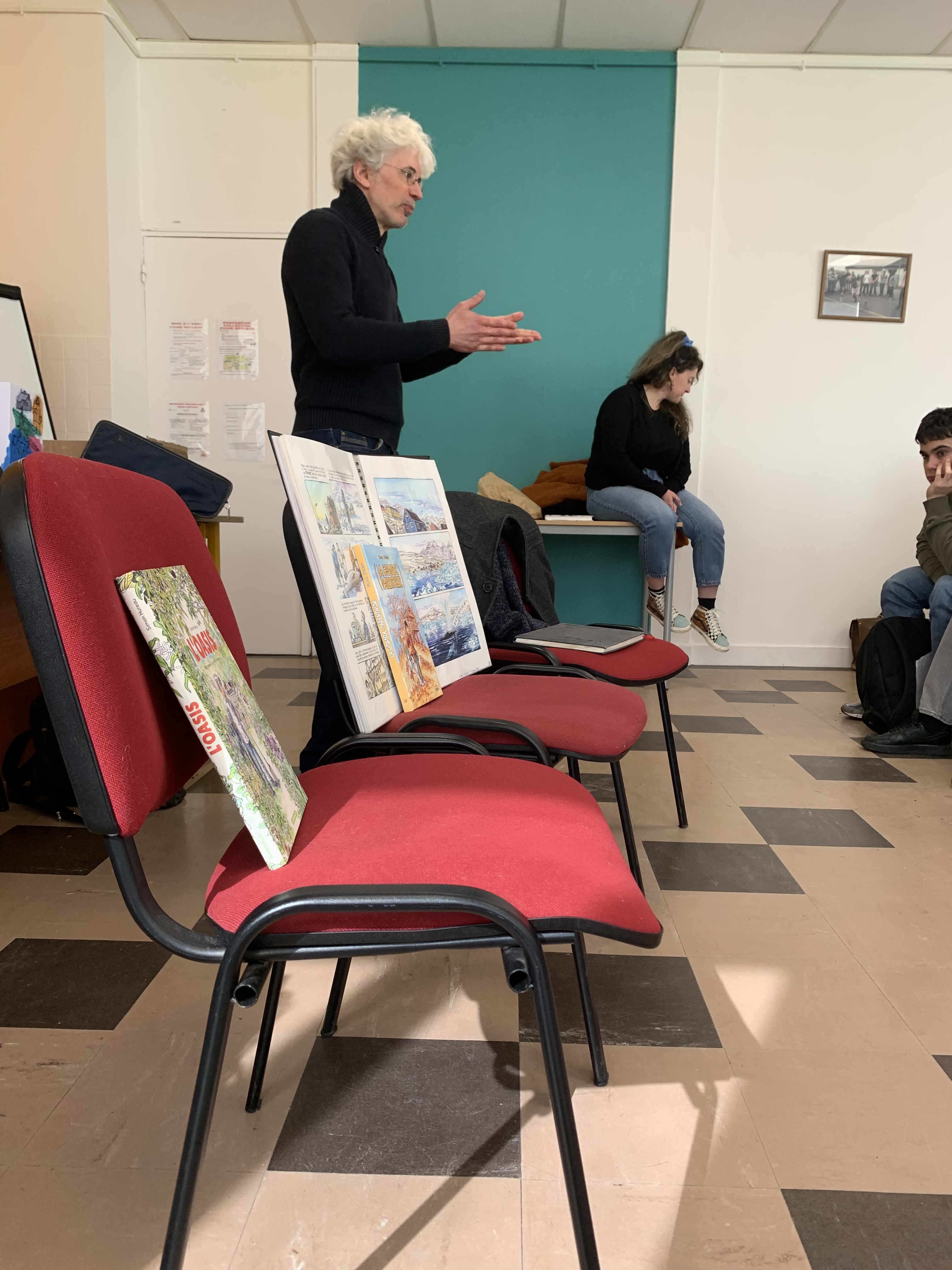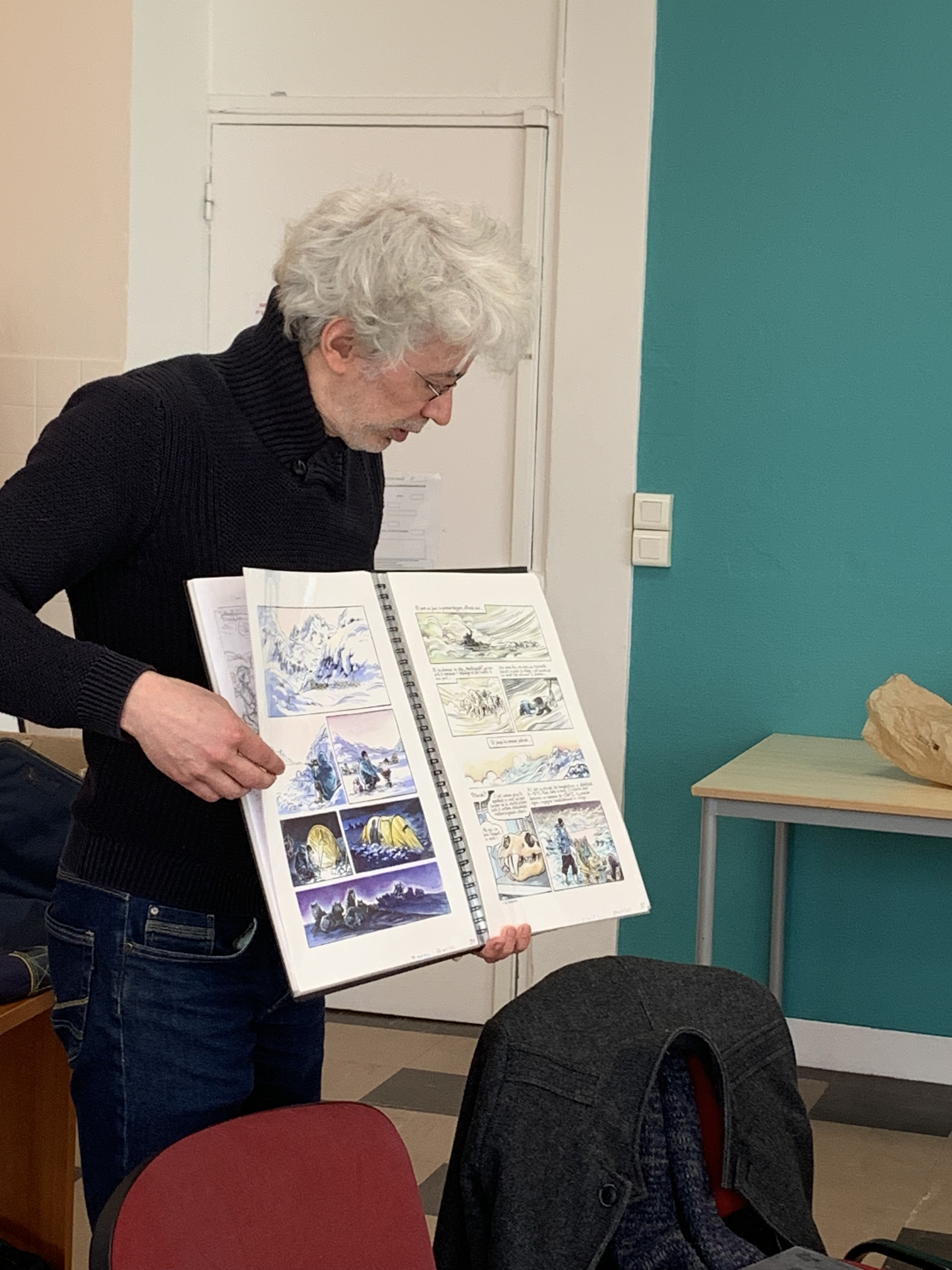 Des étudiants des filières bâtiment, management économique de la construction et des futurs géomètres ont échangé avec l’auteur et lui ont présenté les travaux de transpositions sonores réalisés à partir de la BD étudiée, Sermilik, l’histoire d’un Français parti vivre au Groenland pour y devenir un chasseur traditionnel. Simon Hureau avait apporté pour l’occasion les planches originales de son œuvre et ses croquis préparatoires. Avant de partir, il a dédicacé les exemplaires des étudiants qui le souhaitaient. Il avait d’ailleurs préparé des dessins en petit format pour accompagner chaque dédicace.